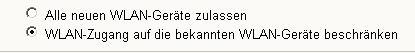 Unter "WLAN-Zugang beschränken (MAC-Address-Filter)" muss nun der erste Eintrag (Neue WLAN-Netzwerkgeräte zulassen) aktiviert werden, da sonst auch mit richtigem Passwort keine Verbindung hergestellt werden kann. Danach unten auf übernehmen klicken und noch einmal testen.